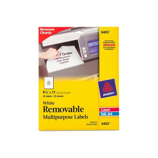 Avery removable inkjet/laser id labels, 8-1/2 x 11, white, 25/pack create and print your own labels. Labels stick, stay and remove easily. This product was made from wood that came from a certified managed forest. Label size - text: 8 1/2 x 11; label color(s): white; machine compatibility: inkjet printers; laser printers; material(s): paper. this product arrives to most customers in 2-3 business days.