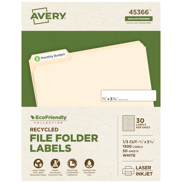 Laser/Inkjet Label, Avery Template Number 45366, For Use With Laser/Inkjet, Label Height 11/16 in, Label Width 3 7/16 in, Color White, Permanent Adhesive, Material Paper, Laminated No, Labels per Sheet 30, Total Number of Labels 1,500, Recycled Content 100 Percent, Package Quantity 1500