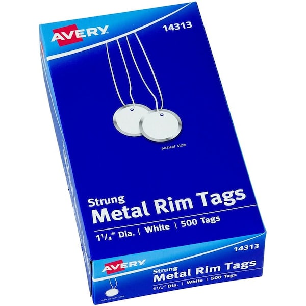 Metal Rim Tags with string are made of white cardstock with a rim of durable metal. The cardstock provides a smooth, clean surface for writing. Nontarnish metal rim reinforces the tag to keep it from bending, twisting or tearing, making the tags ideal for situations where they will be handled frequently or roughly. The knotted white string lets you easily attach the tag to your item and remove the tag without tying and untying.