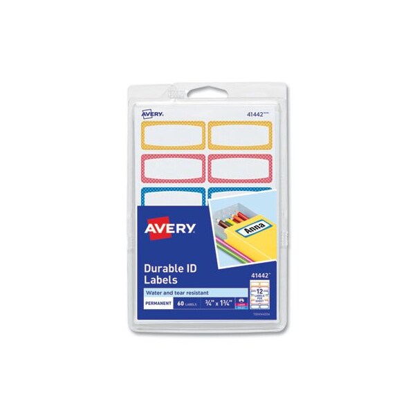 Help kids identify their belongings with the Avery durable labels. Water- and tear-resistant labels are perfect for daycare, school, camping gear, lunchbox items, bottles, sporting goods, and electronic devices. Simply write on with a permanent marker for quick and easy labelling of all your kid's items and keep them out of lost and found. White labels with assorted border colors and permanent adhesive backing. The TrueBlock technology allows you to completely cover up whatever is underneath the label. Shape: Rectangular; Label Size - text: 1.75 x 0.75; Label Colors: White; Color Family: White.