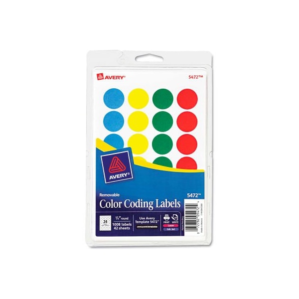 Avery print or write removable color-coding labels, 3/4" dia, assorted, 1008/pack ideal for organizing with color. Labels stick well, remove easily, and leave no residue. Label size - text: 3/4" dia.; label color(s): assorted; machine compatibility: inkjet printers; laser printers; material(s): paper. larger quantity quotes available. Please call 1-888-978-7759. this product arrives to most customers in 2-3 business days.