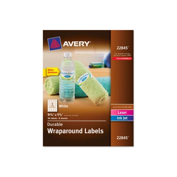 Avery durable wraparound printer labels, 9-3/4 x 1-1/4, white, 40/pack flexible labels conform to curved surfaces for a smooth application. Perfect for water bottles, packaging, containers, marketing materials and more. Water- and scuff-resistant with a permanent adhesive that sticks and stays. Print-to-the-edge feature for a custom look. Laser and inkjet compatible. Label size - text: 9 3/4 x 1 1/4; label color(s): white; machine compatibility: laser printers; inkjet printers; sheet (w x l): 8 1/2 x 11. larger quantity quotes available. Please call 1-888-978-7759. this product arrives to most customers in 2-3 business days.