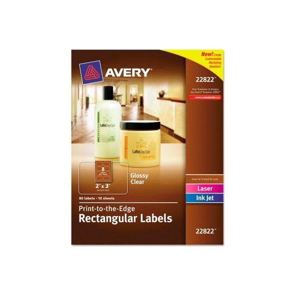 Avery rectangle easy peel labels, 2 x 3, clear, 80/pack print to the edge label design; vivid colors and sharp text can extend right to the end of the label. Easy to customize with avery's free templates and designs. Laser and inkjet compatible. For fast peelingsimply bend the label sheet to expose the pop-up edge. Label size - text: 2 x 3; label color(s): clear; machine compatibility: inkjet printers; laser printers; material(s): paper. larger quantity quotes available. Please call 1-888-978-7759. this product arrives to most customers in 2-3 business days.