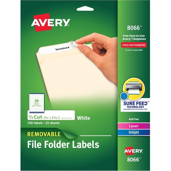 Labels stick, stay and remove cleanly to make changes and revisions. Each label adheres to smooth surfaces, including paper, cardboard, plastic, wood, glass, metal and more. Labels are sized for 1/3-cut tabs on file folders and can be customized with a laser or inkjet printer. Avery offers many easy-to-use templates for Microsoft Word and other popular software programs. Each sheet has 30 labels on FSC certified label paper.