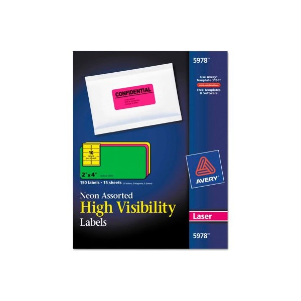 Avery high-visibility laser labels, 2 x 4, assorted neons, 150/pack capture attention with these high-visibility labels ideal for priority messages, addressing, color-coding, and identification, warning labels and more. Get noticed with eye-catching color. Label size - text: 2 x 4; label color(s): assorted neon; machine compatibility: laser printers; material(s): paper. larger quantity quotes available. Please call 1-888-978-7759. this product arrives to most customers in 2-3 business days.