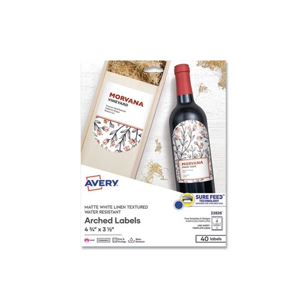 Give an elegant look to all your products and marketing materials with these water-resistant textured labels. Specially designed for the wine industry, our labels will hold their strength when wet, and colors won't run, making them perfect for labeling chilled products. They're ideal for glass bottles and jars, plastic, metal and paper. The upscale look and arched-shape will also add a touch of class to your branded products, brochures and other business items. Use the free templates and designs from Avery Design & Print to personalize your labels for your unique marketing strategy. The Print-to-the-Edge feature lets you apply bright colors and sharp clear text all the way to the edge of the label to vividly showcase your logo or promotion. Customizable marketing solutions are just a few clicks away with these versatile labels. Shape: Arched; Label Size - text: 4.75 x 3.5; Label Colors: White; Color Family: White.