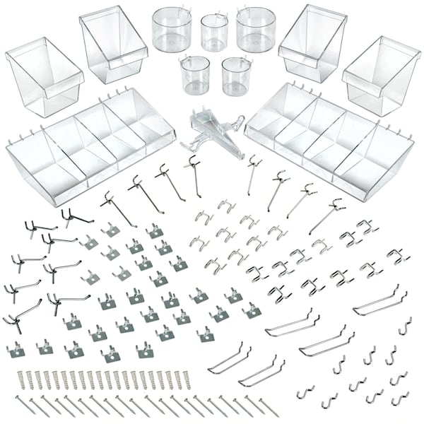 Organize any space with Azar Displays 120-Piece Pegboard Accessory Organizer Kit. Keep your work or craft space neat, clean and items easily accessible. Azar's Accessory Set comes with hooks, screws, bins, and cups to hold and organize any supplies in your home, workplace, garage, shed, basement, craft room, play room, dorm room, storage room, or retail environment. Pegboard not included. Use the peg hardware kit with your own pegboard, all pieces fit a standard .25" diameter peg hole that are 1" on center. The organizer accessory kit includes: 2 pcs. 13”W x 7”D Acrylic Bins, 6 pcs. 7” Dividers for Acrylic Bins, 3 pcs. 3” Diameter Cups, 2 pcs. 4” Diameter Cups, 8 pcs. 2” Metal Hooks, 4 pcs. 5”W x 6”D x 7”H Display Buckets, 1 pc. Eyeglass Holder, 8 pcs. 4” Metal Hooks, 5 pcs. 4” Loop Hooks, 10 pcs. Metal J-Hooks, 30 pcs. Metal Prong Hooks, 20 pcs. Metal U-Hooks, 20 pcs. 2” Dry Wall Screws with Anchors. It's never been easier to tackle those organizational projects such as crafting, sewing, ribbons, scrapbooking, Cricut, art supplies, tools, hardware, children's toys, nerf game and accessories, and loose items. Simply hang the pegboard hook assortment and accessories on your pegboard wall however best suits your needs and you now have a custom peg wall to keep your stuff organized and neat. Use with your own pegboard or choose from one of Azar Display's many colorful pegboard panels. Azar's organizer accessory kit is the perfect solution to help you declutter and get organized anywhere in your home, garage, store, or office.