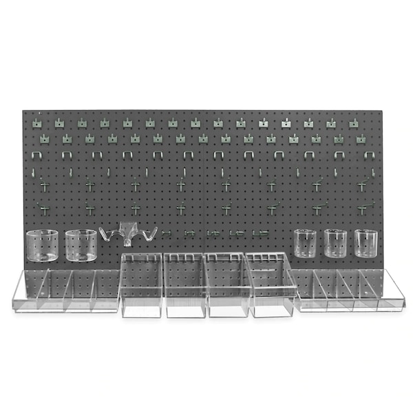 Our pegboard organizer kits are perfect for garages, craft rooms, and dorm rooms. Pegboard organizer kit includes 2 pcs. 24" x 24", 2 pcs. divider bin trays, 6 pcs. dividers for divider bin trays, 3 pcs. 3" dia. cups, 2 pcs. 4" dia. cups, 4 pcs. small display bucket, 1pc. open eyeglass holder, 10 pcs. metal j-hooks, 20 pcs. metal u-hooks, 30 pcs. metal prong hooks, 8 pcs. 2" galvanized metal hooks, 8 pcs. 4" all-wire galvanized hooks, 5 pcs. 4" metal loop hooks, & 20 pcs. mounting hardware screws (screws, plastic spacer, mollys).