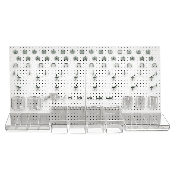 Our pegboard organizer kits are perfect for garages, craft rooms, and dorm rooms. Pegboard organizer kit includes 2 pcs. 24" x 24", 2 pcs. divider bin trays, 6 pcs. dividers for divider bin trays, 3 pcs. 3" dia. cups, 2 pcs. 4" dia. cups, 4 pcs. small display bucket, 1pc. open eyeglass holder, 10 pcs. metal j-hooks, 20 pcs. metal u-hooks, 30 pcs. metal prong hooks, 8 pcs. 2" galvanized metal hooks, 8 pcs. 4" all-wire galvanized hooks, 5 pcs. 4" metal loop hooks, & 20 pcs. mounting hardware screws (screws, plastic spacer, mollys).
