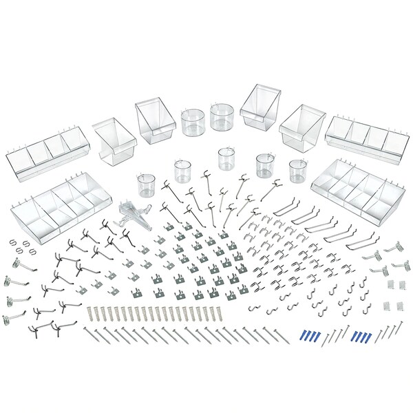 Organize any space with Azar Displays 190-Piece Pegboard Accessory Organizer Kit. Keep your work or craft space neat, clean and items easily accessible. Azar's Accessory Set comes with hooks, screws, bins, and cups to hold and organize any supplies in your home, workplace, garage, shed, basement, craft room, play room, dorm room, storage room, or retail environment. Pegboard not included. Use the peg hardware kit with your own pegboard, all pieces fit a standard 0.25" diameter peg hole that are 1" on center. The organizer accessory kit includes: 2 pcs. 13"W x 4"D Acrylic Bins, 6 pcs. 4" Dividers for Acrylic Bins, 5 pcs. 3" Diameter Cups, 2 pcs. 4" Diameter Cups, 4 pcs. 2" Plastic Locking Hooks, 4 pcs. 4" Plastic Locking Hooks, 4 pcs. Plastic U-Hooks, 14 pcs. 2" Metal Hooks, 12 pcs. 4" Metal Hooks, 14 pcs. Metal J-Hooks, 40 pcs. Metal Prong Hooks, 4 pcs. Metal S-Hooks, 26 pcs. Metal U-Hooks, 2 pcs. 13"W x 7"D Acrylic Bins, 6 pcs. 7" Dividers for Acrylic Bins, 4 pcs. 5"W x 6"D x 7"H Display Buckets, 1 pc. Open Eyeglass/Sunglass Holder, 5 pcs. 4" Loop Hooks and 36 pcs. 2" Dry Wall Screws w/Anchors. It's never been easier to tackle those organizational projects such as crafting, sewing, ribbons, scrapbooking, Cricut, art supplies, tools, hardware, children's toys, nerf game and accessories, and loose items. Simply hang the pegboard hook assortment and accessories on your pegboard wall however best suits your needs and you now have a custom peg wall to keep your stuff organized and neat. Use with your own pegboard or choose from one of Azar Display's many colorful pegboard panels. Azar's organizer accessory kit is the perfect solution to help you declutter and get organized anywhere in your home, garage, store, or office.