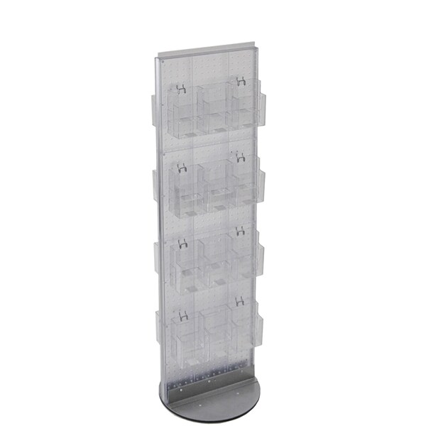 Two-Sided 16”W x 60”H pegboard panel with revolving 16” dia. base. Assembled: 16”W x 61”H. This unit comes with eight two-tier 6-pocket tri-fold brochure holders totaling 48 pockets. Each pocket measures 4.625”W x 2”D x 5”H. Pockets are removable and adjustable. Sign holder strip and U-Hooks included. Available in clear pegboard only.