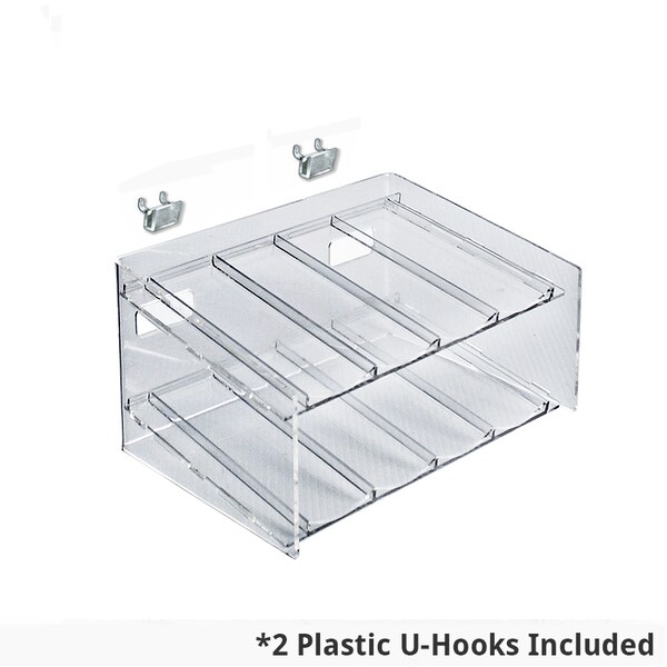 Use these attractive displays on pegboard, slatwall, or countertop to present an assortment of products in a neat and organized arrangement. Choose from two to five tiers, available in four different compartment sizes. Plastic U-Hooks included for use on pegboard and slatwall.