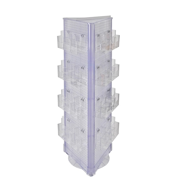 Triangle Three-Sided Tower 16”W x 60”H pegboard panel with revolving base. Assembled: 17”W x 61”H. This unit comes with 12 two-tier 6-pocket tri-fold brochure holders totaling 72 pockets. Each pocket measures 4.625”W x 2”D x 5”H. Pockets are removable and adjustable. Sign holder strip and U-Hooks included. Available in clear pegboard only.