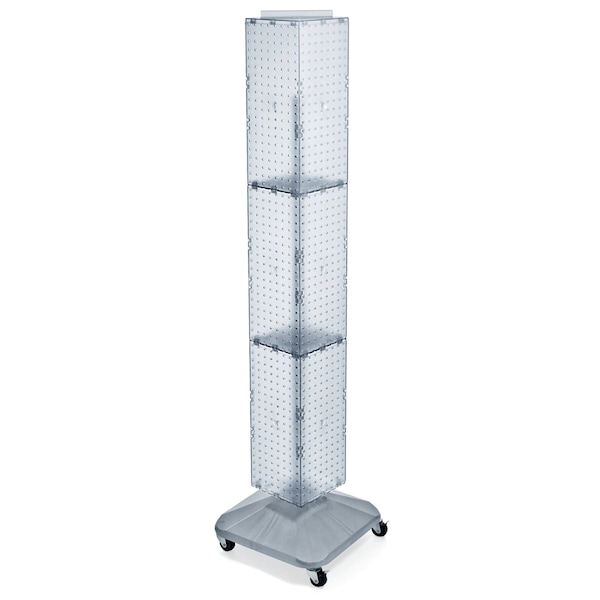 This 4-sided pegboard interlocking Floor Display measures 8"W x 8"D x 60"H and revolves on a silver plastic wheeled base. Easy to assemble (no tools required). Sign holder and hooks sold separately.