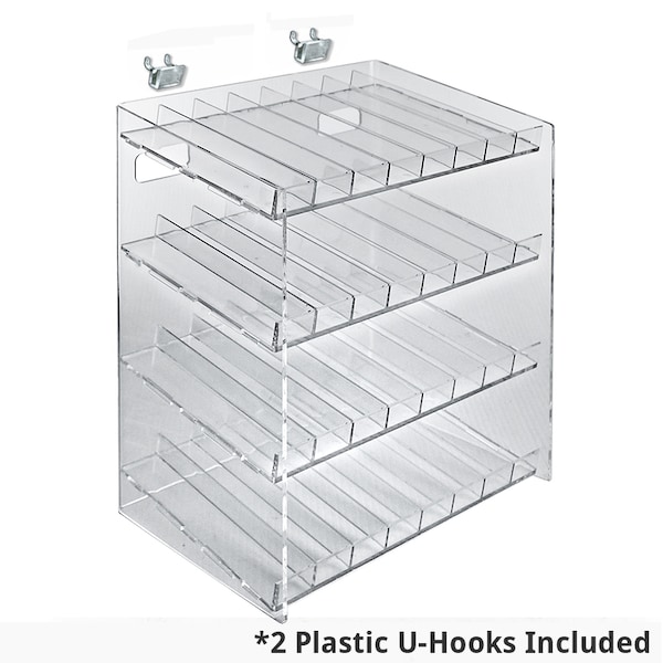 Use these attractive displays on pegboard, slatwall, or countertop to present an assortment of products in a neat and organized arrangement. Choose from two to five tiers, available in four different compartment sizes. Plastic U-Hooks included for use on pegboard and slatwall.