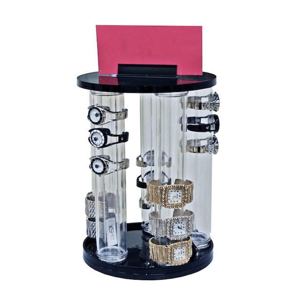 Vertical Counter Display features 5 acrylic poles and stands on a black plastic revolving base. Cap is not removable; For cuffed or clasped items only.