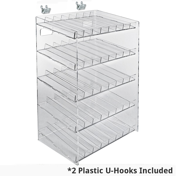 Use these attractive displays on pegboard, slatwall, or countertop to present an assortment of products in a neat and organized arrangement. Choose from two to five tiers, available in four different compartment sizes. Plastic U-Hooks included for use on pegboard and slatwall.