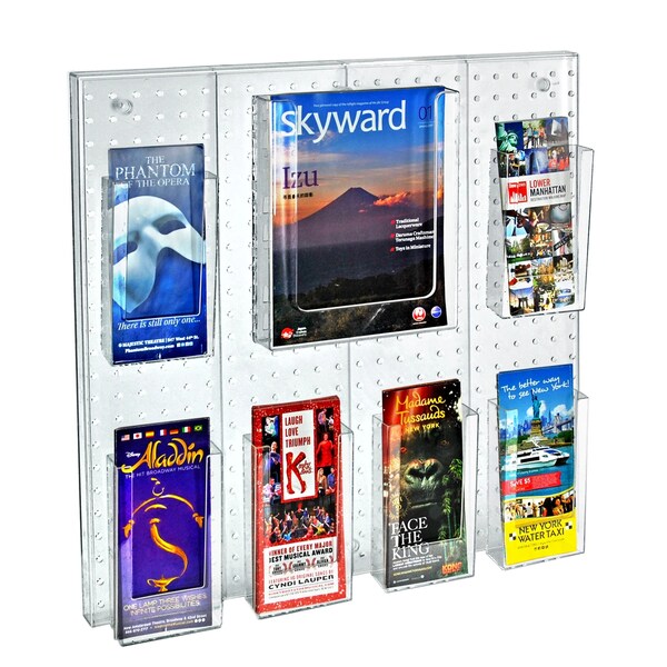 Azar Displays Seven Pocket Multi-Tier Modular Wall Brochure Holders are very stylish and ideal for displaying trifold brochures, pamphlets, letter size flyers or magazines on your wall. These multi-pocket organizers has six pockets that hold a standard Tri-Fold literature, ideal for size 4”W x 8.5" H brochure, and 1 pocket that holds letter size reading material ideal for size 8.5”W x 11”H. The Pamphlet holder is the perfect solution to display your reading materials vertically in small or crowded locations where there is not enough counter, shelf or tabletop space. Presenting information to your potential customers is essential to your success. That’s why it’s important to keep your reading material within reach using these practical and versatile Azar Marketing Holders. Great to use these literature dispensers for a wide range of messaging, advertising, or marketing. Keep your printed materials in a neat and organized arrangement and your counter space clutter-free. Give your professional environment a modern and sleek look that will complement any décor. Place this pamphlet flyer display in a main location within your business to create a common area for customers to visit and access your important take-home reading materials. Ideal to place in doctor offices, government and business offices, community centers, travel agencies universities, convention centers, café’s, real estate offices, stadiums, convenience stores, museums, hotels, airports, schools, retail stores, lobbies and so much more! These premium acrylic brochure pockets are injection molded, creating a strong, durable, and crystal-clear appearance. The Clear Frosted Pegboard is 24" x 24" and the 6 tri-fold brochure pocket sizes are 4.375” w x 7.875” h and the 1 Letter size brochure pocket is 9.125” w x 11.25” h. Hardware Included to hang the brochure pockets on the pegboard and screws are included for hanging pegboard to the wall. These brochure racks are available in 7 pocket and 10 designs. Easy to Assemble. Sold in packs of 1.