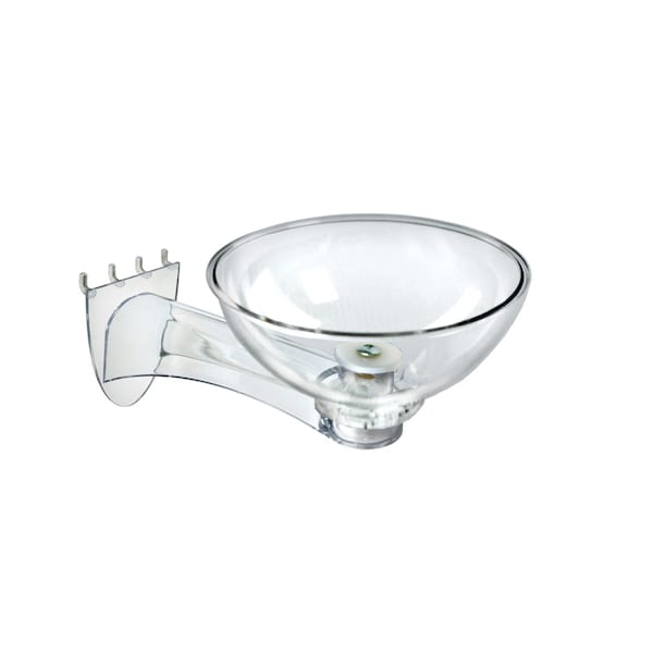 This kit includes a clear plastic bowl measuring 8" diameter with the 4" depth on a 9.25" plastic extension arm. Use on existing pegboard/slatwall display.