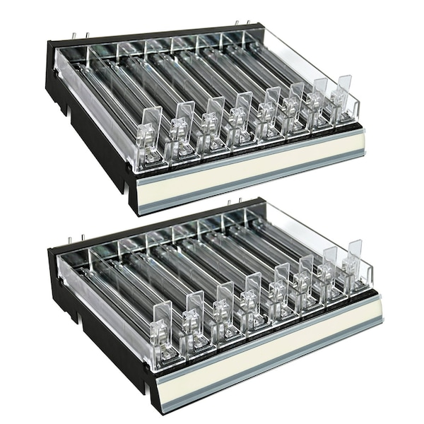 Azar Displays Divider Tray is a game-changer for the retail industry. The 8 compartment divider insert creates a 8 slot divider tray system. Simply snap in the molded 8 compartment insert onto the tray. Add the included Pusher Tracks to keep your product pushed up front and always clearly visible. Each kit includes 2 of the 8 slot snap on dividers and pushers to make 16 rows of product, 8 rows on each Tray. Compartment size of each slot is 1.375"W x 7.5625"D (x8 per tray). The merchandiser tray is designed with an interlocking system to connect additional trays, giving the ability to create a long shelf of these trays. This kit also includes 4 U-hooks that can hang onto any pegboard and most slat wall giving plenty of flexibility of how and where this product can be used. The cosmetic shelf sits at a 90 degree angle off the wall. The tray bin can sit on a counter as well. This cosmetic kit also comes with 2 graphic c-channels to adhere to the front for displaying brand name, color swatches or product titles. This retail display tray kit is the right choice for merchandising nail polishes, lip gloss, mascara, essential oil droppers, hand sanitizers, cosmetic assortments, boxed products, and more! The Tray is available in Black or Clear, and the Insert Divider is Clear.
