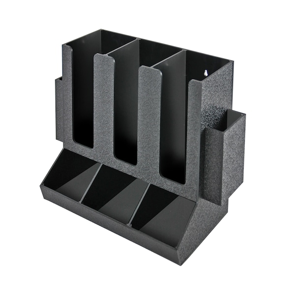 Azar’s Black Eight Compartment Two-tiered Condiment Organizer is perfect to use at concession stands, bar tops, cafes, cafeterias, lunch rooms, and office break rooms. The compartments can hold mustard, ketchup, salt, pepper, sugar packets, tea packets, creamers, jellies, honey, relish and K-cups. This caddie is made of durable plastic with a black speckled and textured finish exterior and a smooth black glossy finish on the inside. The compact design saves space on your counter top. The unit has holes in the back so it can be mounted to the wall if desired (hardware not included). The open front allows for easy viewing of items. There are ten wide openings, making it simple to access and refill items, as well as, monitor stock levels. This organizer is already assembled. Purchase multiple units to accommodate your exact needs. Check out Azar’s 4 compartment unit, item# 400321 - place side by side to create a 12 compartment unit. This storage unit is a great addition to any food service environment.