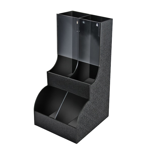 Azar’s Black Four Compartment Two-tiered Condiment Organizer with Clear Front is perfect to use at concession stands, bar tops, cafes, cafeterias, lunch rooms, and office break rooms. The compartments can hold mustard, ketchup, salt, pepper, sugar packets, tea packets, creamers, jellies, honey, relish and K-cups. This caddie is made of durable plastic with a black speckled and textured finish exterior and a smooth black glossy finish on the inside. The compact design saves space on your counter top. The unit has holes in the back so it can be mounted to the wall if desired (hardware not included). The clear front allows for easy viewing of items. There are four wide openings, making it simple to access and refill items, as well as, monitor stock levels. This organizer is already assembled. Purchase multiple units to accommodate your exact needs. Check out Azar’s 6 compartment unit, item# 400323 - place side by side to create a 10 compartment unit. This storage unit is a great addition to any food service environment.