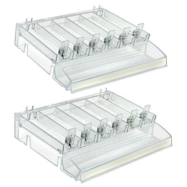Azar Displays Divider Tray with Attached Tester Tray is a game-changer for the retail industry. The 6 compartment divider insert creates a 6 slot divider tray system. Simply snap in the molded 6 compartment insert onto the tray. Add the included Pusher Tracks to keep your product pushed up front and always clearly visible. Each kit includes 2 of the 6 slot snap on dividers and pushers to make 12 rows of product, 6 rows on each Tray. Compartment size of each slot is 1.75"W x 7.5625" (x6 per tray). The tray has an attached Tester Tray on the front (not removable) that measures 12” wide x 3” deep and allows customers to see and feel product before they purchase. The merchandiser tray is designed with an interlocking system to connect additional trays, giving the ability to create a long shelf of these trays. This kit also includes 4 U-hooks that can hang onto any pegboard and most slat wall giving plenty of flexibility of how and where this product can be used. The cosmetic shelf sits at a 90 degree angle off the wall. The tray bin can sit on a counter as well. This cosmetic kit also comes with 2 graphic c-channel holders to adhere to the front for displaying brand name, color swatches or product titles. This retail display tray kit is the right choice for merchandising nail polishes, lip gloss, mascara, essential oil droppers, hand sanitizers, cosmetic assortments, boxed products, and more! The Tray is available in Clear, and the Insert Divider is Clear.