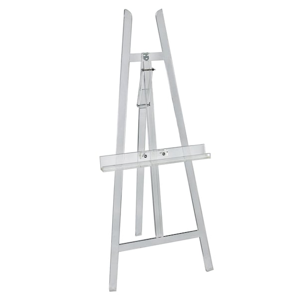Azar Displays floor standing adjustable artist easel is made of clear acrylic giving a modern transparent design that will match any decor. The shelf that holds your picture or canvas measures 22.5'' wide and is adjustable up and down with no tools required. The adjustable mechanism is simple to use, just loosen the screws to adjust the shelf up or down, and then twist to hold it in place. Choose the perfect height for you. The back easel leg is also adjustable so you can make the easel as tall as 57.5'' high or lower if needed just by pulling the back leg out to fit your needs. The A-frame construction makes this easel very sturdy to display artwork, canvases, framed pictures or any other large format art or graphic. The folding design allows this easel to become an easily portable tripod to put away when not in use. Ideal for artists or painters or to display artwork vertically or horizontally. Can also be used at parties, events, convention centers, trade shows or in lobbies for announcements or signing boards. Easy to Assemble. The floor standing easel measures 24'' wide x 57.5'' high in full standing position.