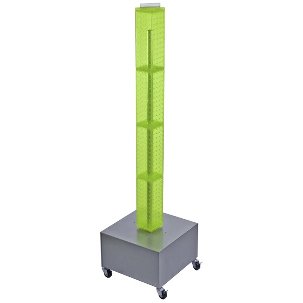 This 4-sided pegboard interlocking floor unit measures 4" W x 4" D x 48" H and revolves on a silver metal wheeled base. Easy to assemble (no tools required). Sign holder and hooks sold separately.