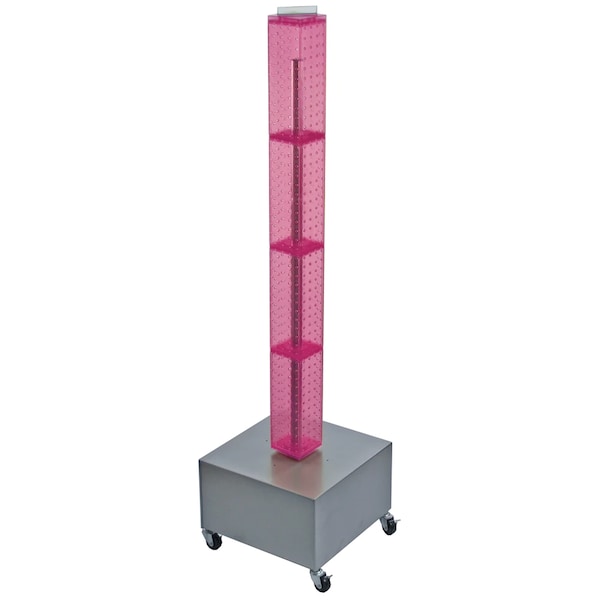 This 4-sided pegboard interlocking floor unit measures 4" W x 4" D x 48" H and revolves on a silver metal wheeled base. Easy to assemble (no tools required). Sign holder and hooks sold separately.
