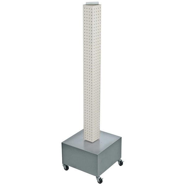This 4-sided pegboard interlocking floor unit measures 4" W x 4" D x 48" H and revolves on a silver metal wheeled base. Easy to assemble (no tools required). Sign holder and hooks sold separately.