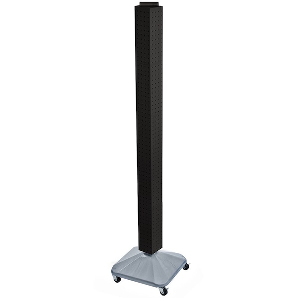 This 4-sided pegboard interlocking floor unit measures 4" W x 4" D x 60" H and revolves on a silver plastic wheeled base. Easy to assemble (no tools required). Sign holder and hooks sold separately.