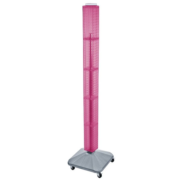 This 4-sided pegboard interlocking floor unit measures 4" W x 4" D x 60" H and revolves on a silver plastic wheeled base. Easy to assemble (no tools required). Sign holder and hooks sold separately.