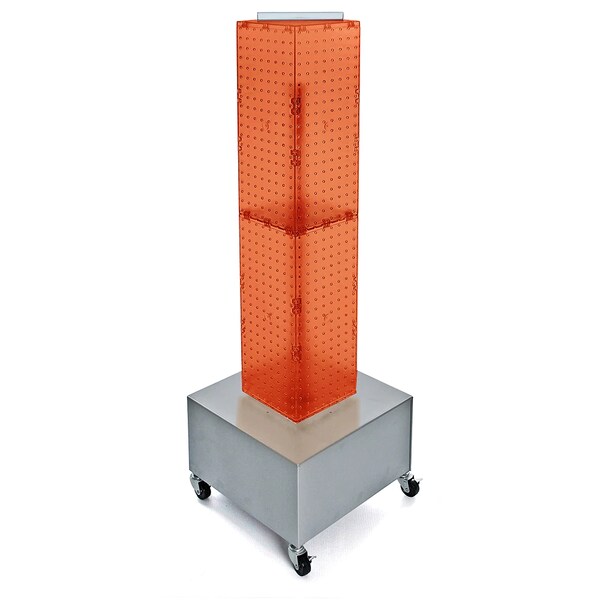 This 4-sided pegboard interlocking Floor Display measures 8" W x 8" D x 40"H and revolves on a silver metal wheeled base. Easy to assemble (no tools required). Sign holder and hooks sold separately.