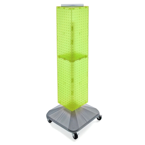 This 4-sided pegboard interlocking Floor Display measures 8" W x 8" D x 40"H and revolves on a silver plastic wheeled base. Easy to assemble (no tools required). Sign holder and hooks sold separately.