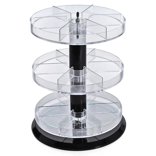 Acrylic counter display features three 11" round trays with 6 compartments for each tray. Each tray measures 2" high; the overall unit height is 13.5".The height between tiers is approx. 4.375". This tabletop display is a convenient cosmetic display or suitable to hold any small product.