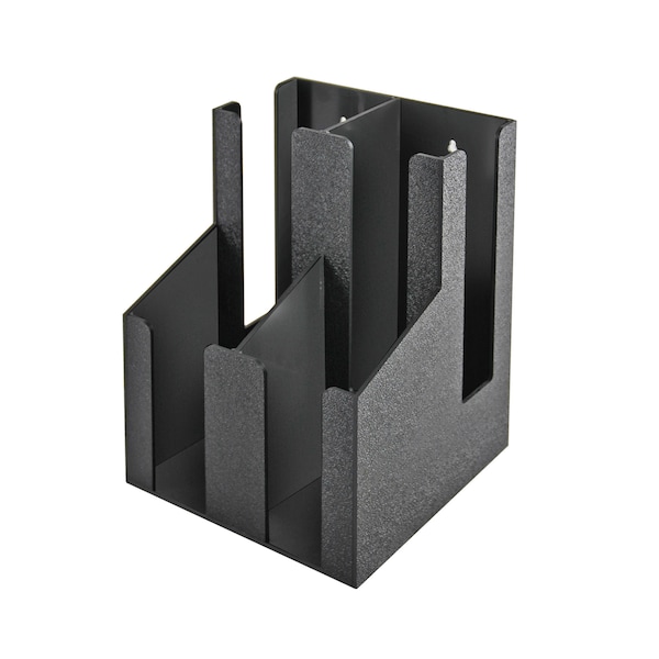 Azar's Black Two-Tier Four Compartment Organizer for Plastic Cups and Lids are perfect for keeping your beverage station tidy. This counter top or wall mount unit is designed to hold standard-sized, 4 in. diameter, Styrofoam or paper cups and plastic lids. The coffee caddie is great for restaurants, cafes, specialty shops, cafeterias, or the office break room. Keep drink supplies accessible and in a neat arrangement. Each caddie has two same size compartments for cups and two same size compartments for lids. This cup holder is made of durable plastic with a black speckled and textured finish exterior and a smooth black glossy finish on the inside. This design gives visibility to items so it is easy to monitor stock level. The unit has holes in the back so it can be mounted to the wall if desired hardware not included. Great space saver for use on the counter or wall. The unit is easy to clean and maintain. This storage unit is a great addition to any food service environment.