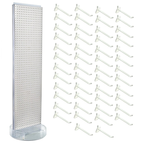 White Two-Sided Pegboard Floor Display On Revolving Studio Base with 50 6in White Hooks