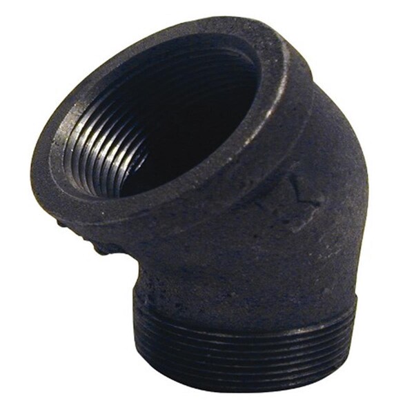 Malleable black iron street elbow 1-1/4 fip x 1-1/4 mip45 degreeastm a-197for gas oil air rated to 300 PSI at 150 f; steam 150 PSI class 150 standard ansi standard b16.3 unions: 16.39 box with upc . . Features 1-1/4 FIP x 1-1/4 MIP 45 Degree ASTM A-197 For gas oil air Rated to 300 PSI at 150 F; steam 150 PSI Class 150 standard ANSI Standard B16.3 Unions: 16.39 Box with UPC label Specifications Dimension: 2.25 H x 2.75 W x 3 L Weight: 0.8 lbs