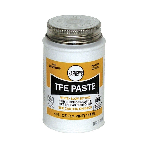 TFE Paste is a white thread compound lubricates all threaded joints, is non-hardening, non-separating and withstands up to 3,000 PSI on gases from -50 to +400 Fahrenheit and 10,000 PSI on liquids from -50 to +500 Fahrenheit. For use with plastic or metal