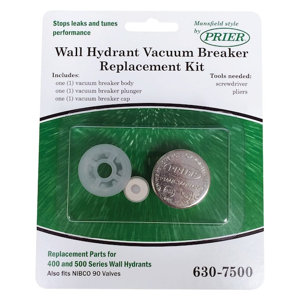 Prier's Vacuum Breaker Replacement kit works with all Mansfield style 400 and 500 series wall hydrants. This kit includes all parts needed to replace the anti-siphon vacuum breaker.