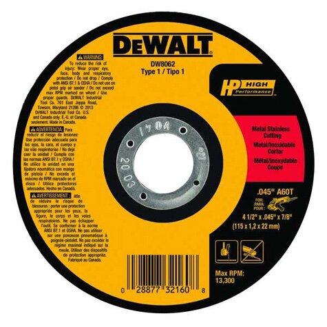Depressed Center Grinding Wheel, Type 27, 4 1/2 in Dia, 0.25 in Thick, 7/8 in Arbor Hole Size