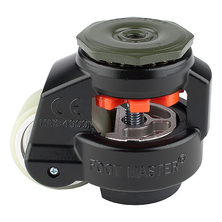 Leveling Caster, Ratchet, 50 mm Nylon Wheel, 1/2-13 Stem, Swivel, 250 kg Cap, PU Foot Pad, Black