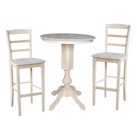 Round 30 in Rd Pedestal Bar Height Table, 2 Madrid Bar Height Stools, Unfinished, 30 in W, 30 in L