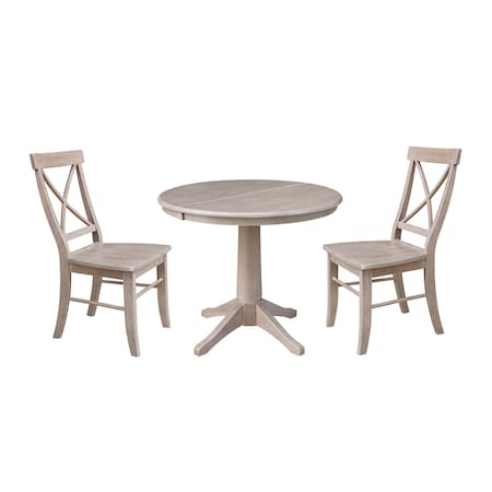 Round 36 in Rd Extension Dining Table, 2 X-Back Chairs, Washed Gray Taupe, 36 in W, 48 in L, Wood