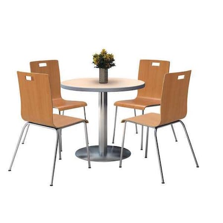 Round KFI Round 36" Dia. Pedestal Table with 4 White Stacking Bentwood Chairs, Walnut Laminate Top
