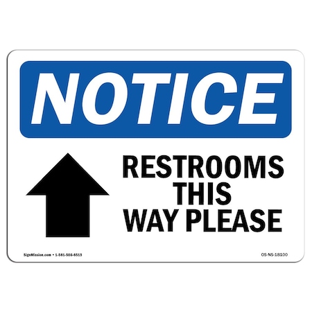 OSHA Sign, 12" H, Rigid Plastic, Restrooms This Way Please (Up Arrow) Sign With Symbol, Landscape