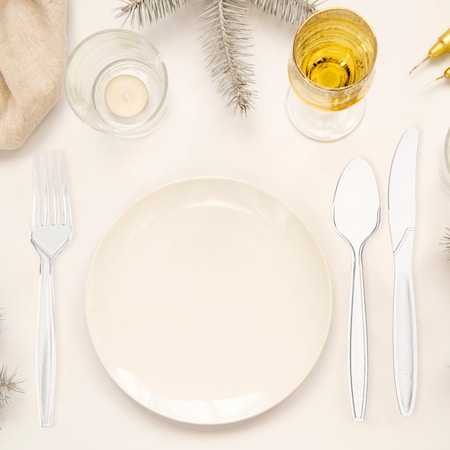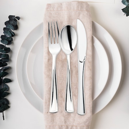 Shiny Metallic Silver Plastic Cutlery Combo Set - Spoons, Forks and Knives (120 Guests), 360PK