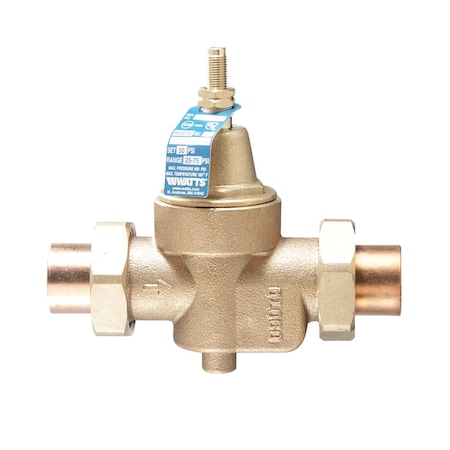 3/4in Lead Free Water Pressure Reducing Valve, Double Union, Solder, Adjust 25-75 psi, Max Work 400