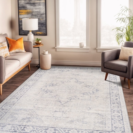 Blue and Ivory Medallion Rug - Machine Washable, Flat Pile, Family Friendly 5 ft x 7 ft